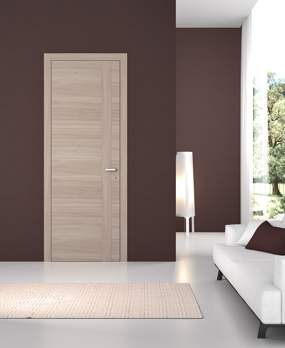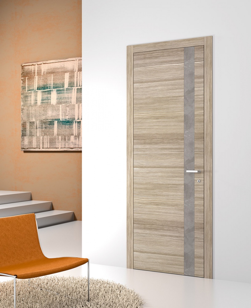 Kovinski vložki, prevlečeni z barvo vrat, so vstavljeni v nasprotni smeri lesnih žil in tako ustvarijo občutek gibanja.